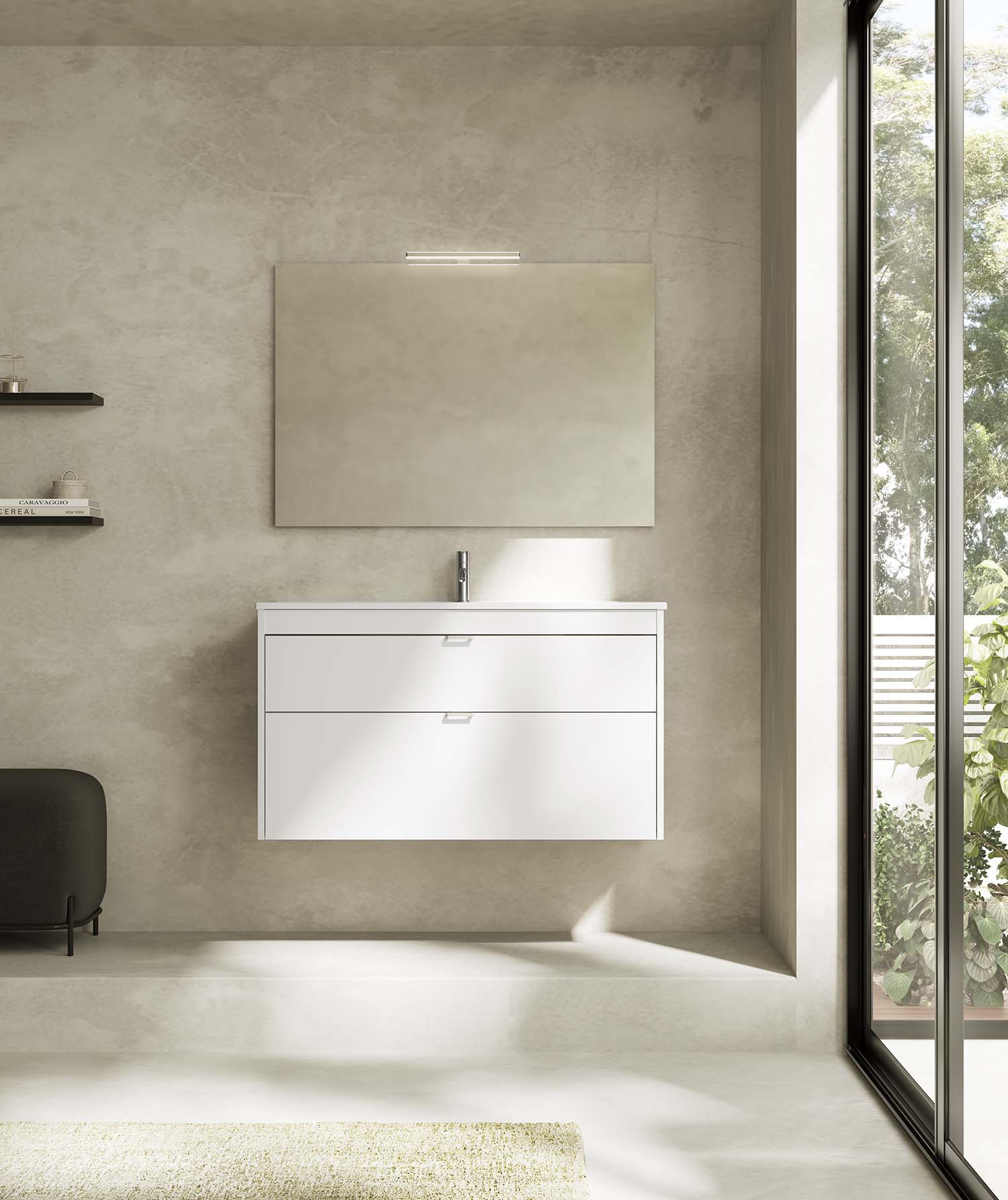 Funcionalidad con un diseño de líneas rectas, un discreto tirador integrado con nuestro logo en el cajón superior, y un frente bajo del lavabo para generar simetría.
