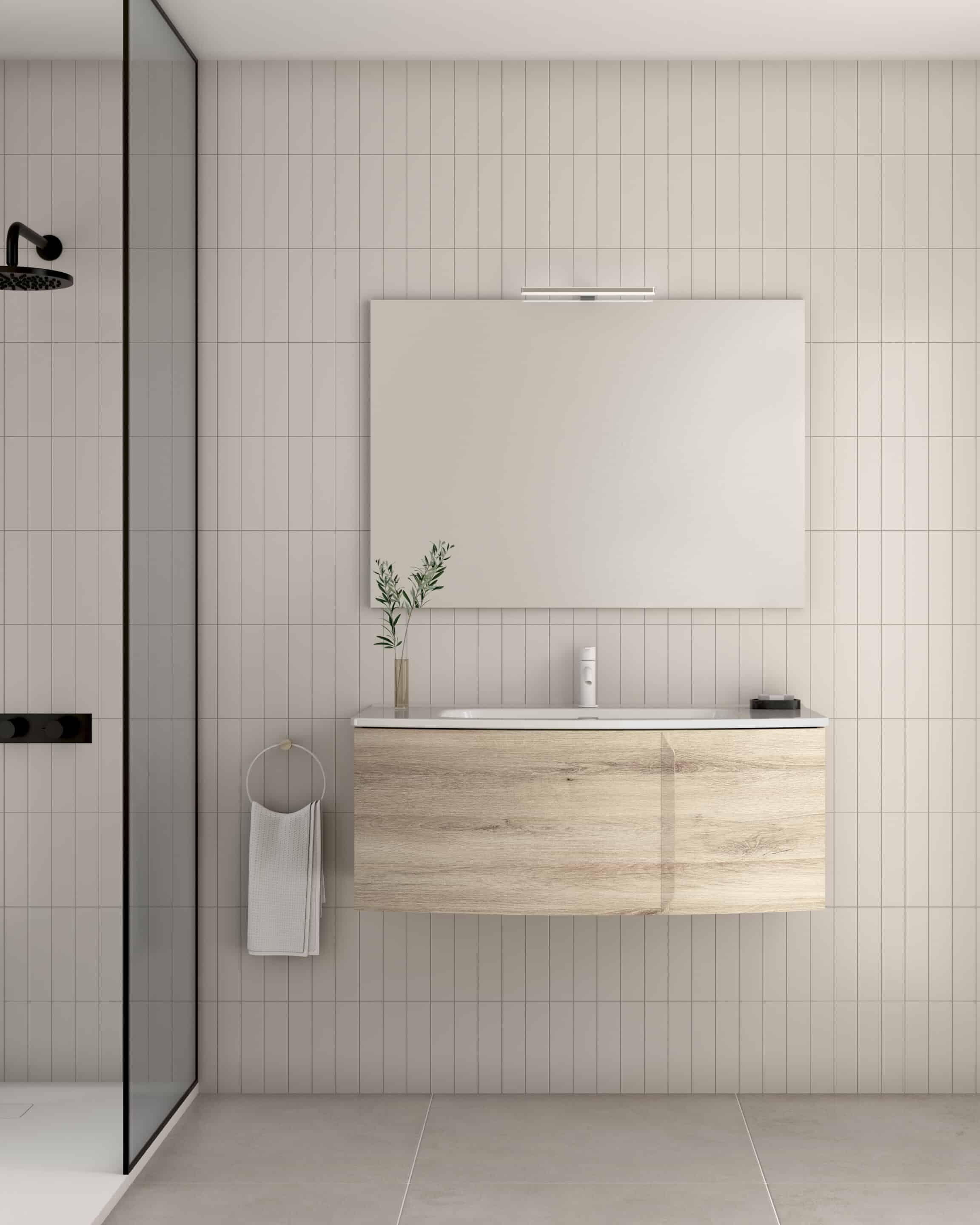 Conjunto completo: Mueble Wave + lavabo cerámico Trend blanco brillo + espejo Murano + luminaria Lucce 30)