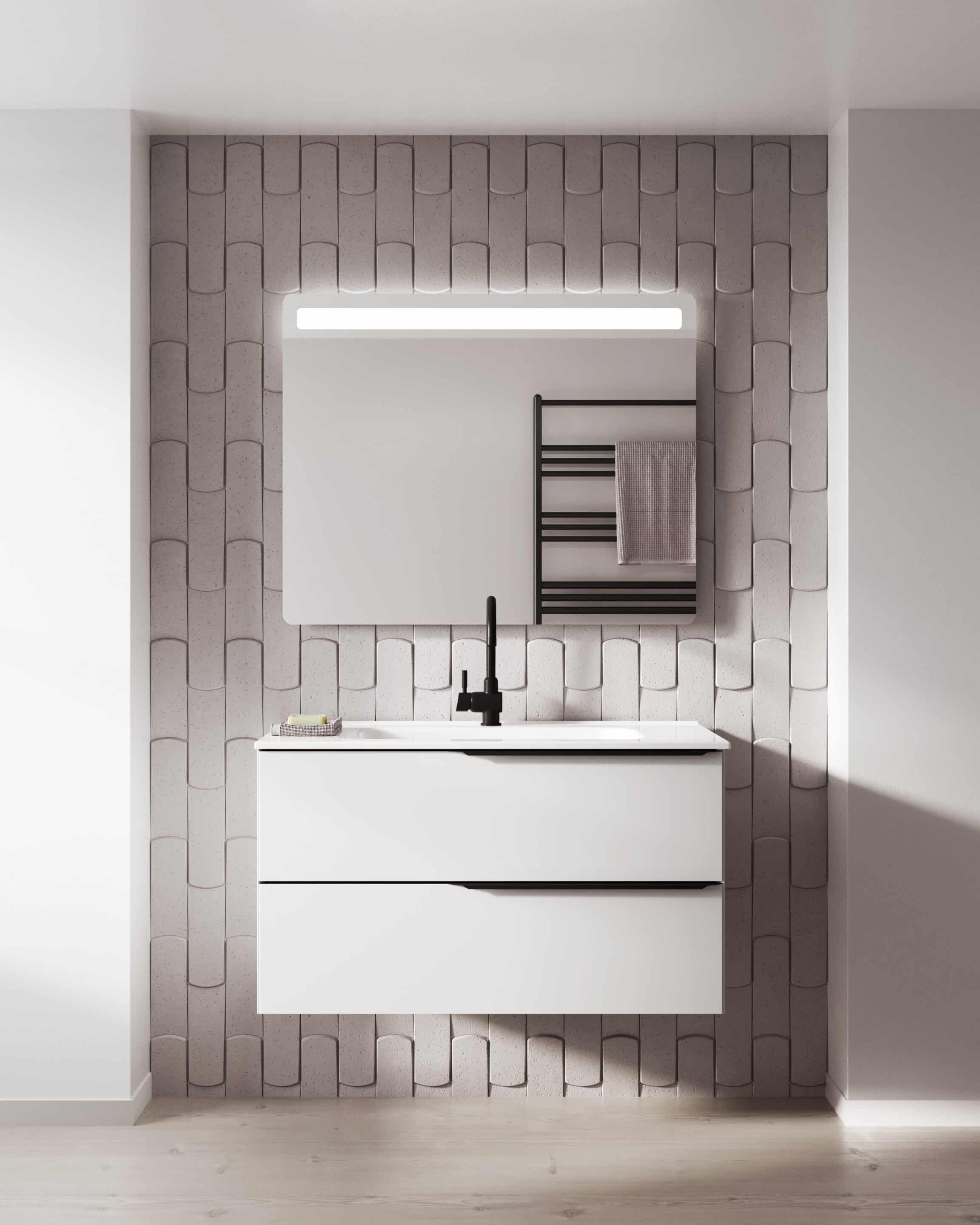Conjunto premium: Mueble Mio + lavabo cerámico Enzo blanco brillo + espejo led Lys)