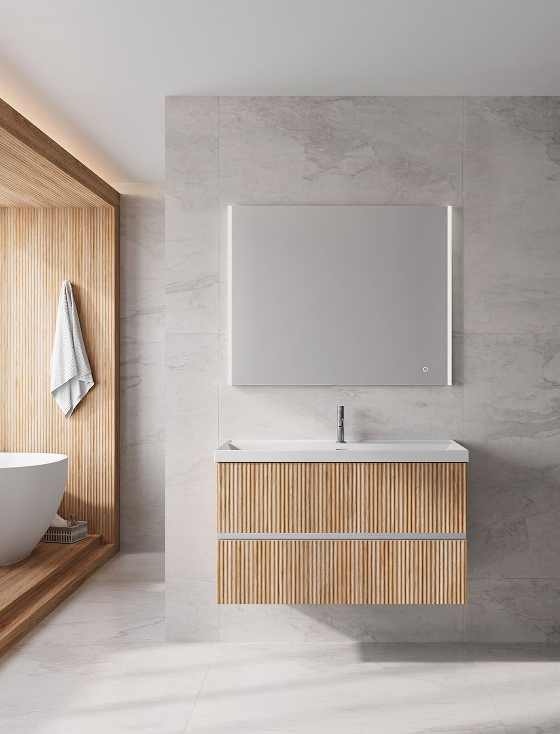 Conjunto premium: Mueble Vora + lavabo cerámico Cairo blanco brillo + espejo led Aine)